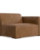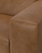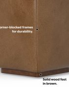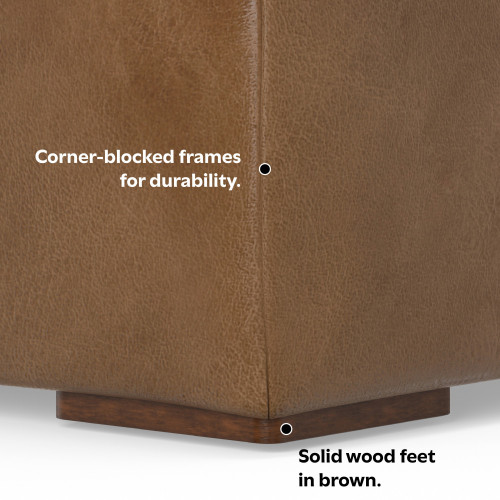 - Upholstered in Caramel Brown Kind Leather, a high-quality, genuine aniline, Brazilian leather made through an environmentally friendly process that minimizes waste and maximizes the natural color and grain of the leather.